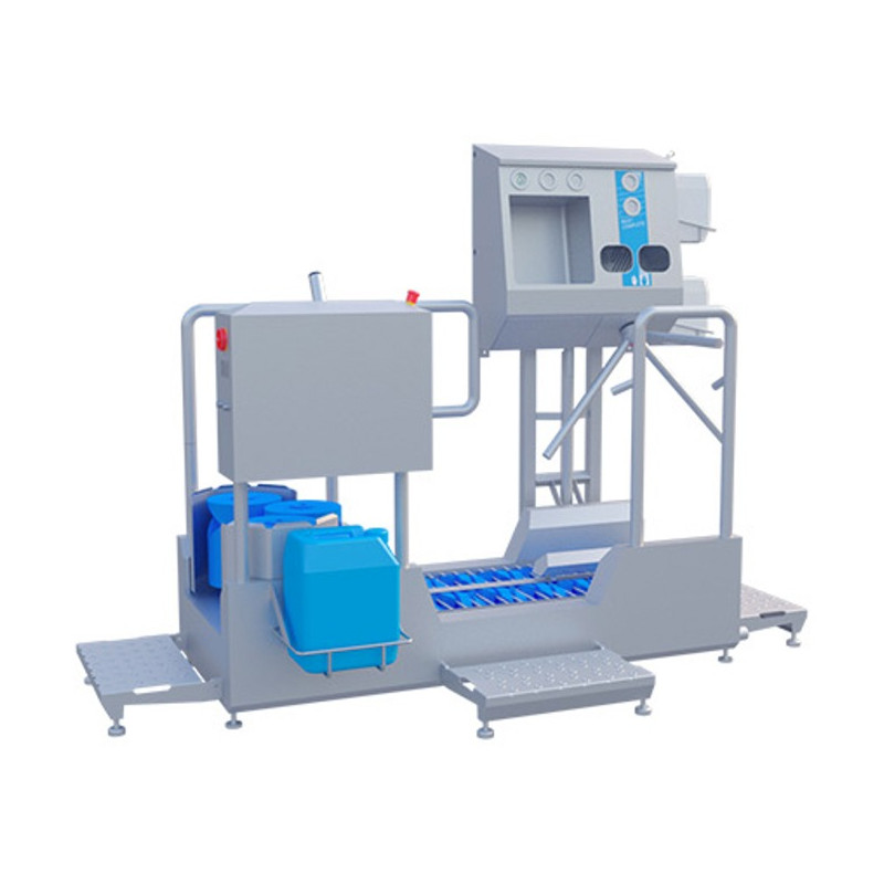 La máquina limpiabotas de botas tipo 23830-1000 que permite la limpieza continua de cañas y suelas con cepillos para suelas de 1000 milímetros de largo. La interacción de los dos cepillos de suela de cerdas helicoidales y de los 3 cepillos de limpieza de ejes dispuestos verticalmente permite una limpieza rápida de las botas en un proceso continuo.