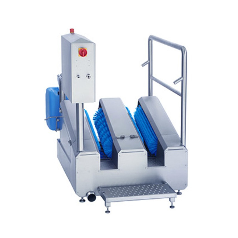 El limpiabotas de paso modelo 23835 limpia las cañas y las suelas del calzado de trabajo de forma rápida y eficaz. Puede limpiar hasta diez pares de botas por minuto. Dos sensores difusos integrados en la barandilla activan la rotación de los cepillos cuando una persona accede al equípo. La disposición de los cepillos permite un movimiento hacia abajo desde la caña hasta la suela.