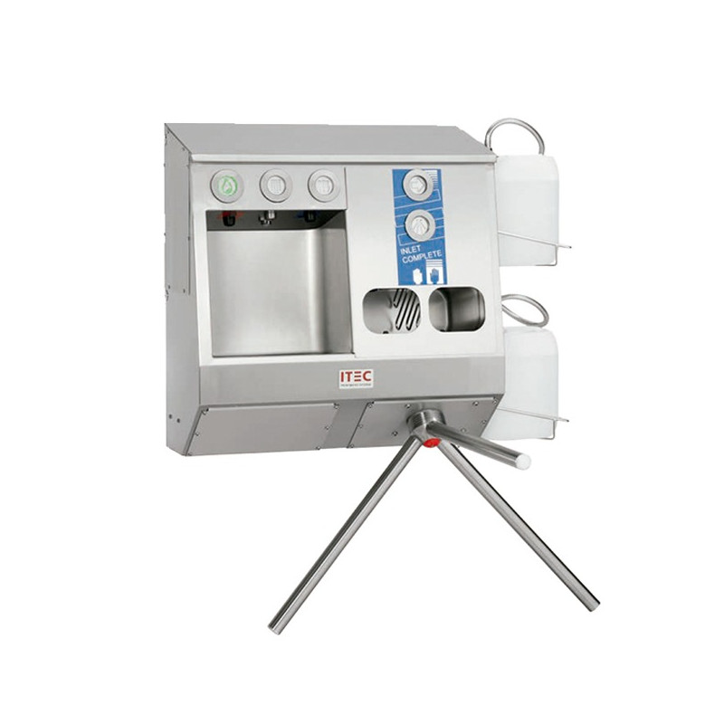 Completa Higiene de las manos en el punto de acceso a las áreas de producción mediante una unidad compacta que combina un punto de lavado de manos, con dispensadores completamente automáticos de jabón y desinfectante líquido y un torniquete motorizado.