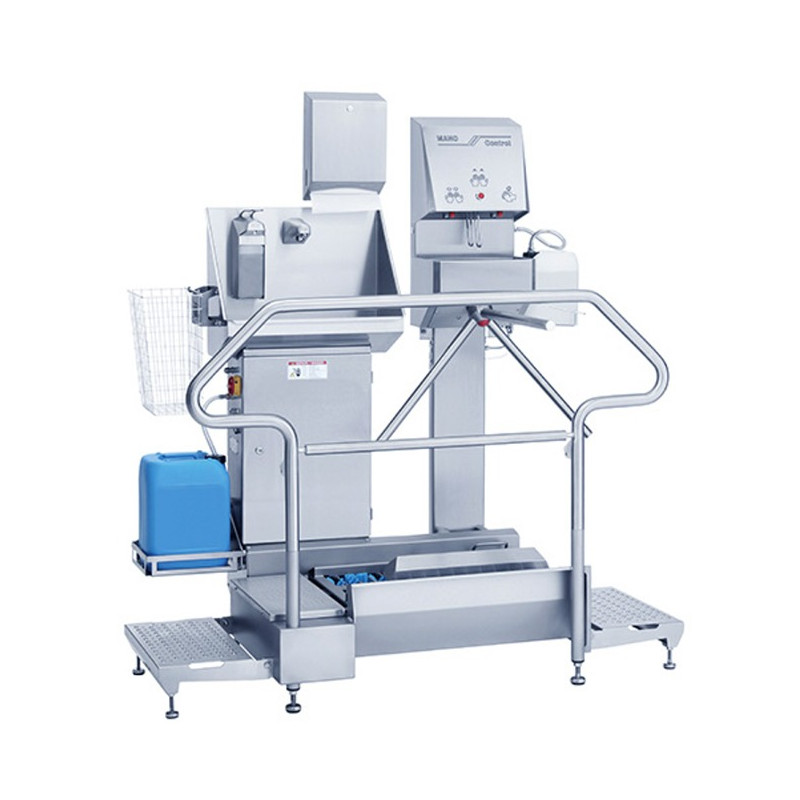 La estación higienizante modelo 23876-800 proporciona una limpieza y desinfección eficaces de las suelas al entrar en la zona de producción en un proceso paso a paso. El Mano Control integrado modelo 23745 garantiza una desinfección de manos sin contacto y el torno motorizado un control de acceso seguro.