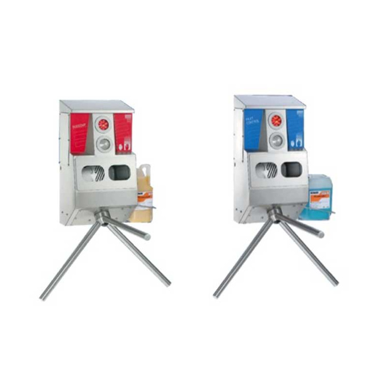 El DUOSOAP funciona de la siguiente manera: ambas manos se colocan en la unidad dispensadora de jabón al mismo tiempo, con la palma hacia arriba y el equipo controla la cantidad de jabón que se rocía en ambas manos. La cantidad de jabón es ajustable. A la vez, un sistema de semáforos muestra cuándo se permite el acceso a través de un torniquete impulsado por motor.