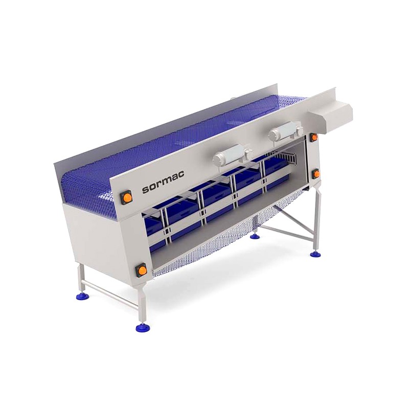 La cinta separadora Sormac consiste en un armazón y una cinta de eslabones con una perforación especial, que permiten la separación de pequeñas partículas del flujo de productos, principalmente hortalizas de hoja. La cinta se utiliza por lo general antes de la fase de lavado, para eliminar cotiledones, piedrecillas, gránulos de tierra e insectos.