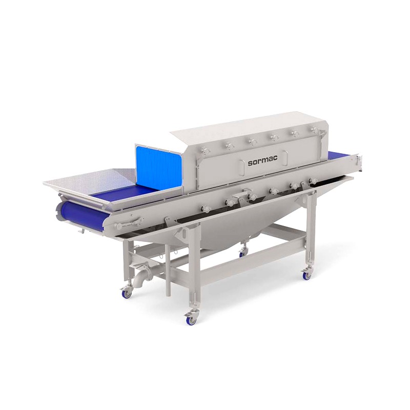 La lavadora de cinta tipo BW está hecha para lavar frutas y verduras en cantidades pequeñas e intermedias. El producto se carga en la cinta de malla entretejida y se transporta a través del túnel. En el interior del túnel hay boquillas rociadoras montadas por debajo y por encima de la cinta que ejercen sobre el producto una acción de lavado intensiva. En la primera sección, el producto se lava a fondo con agua recirculada. En la segunda sección, se enjuaga con agua limpia.