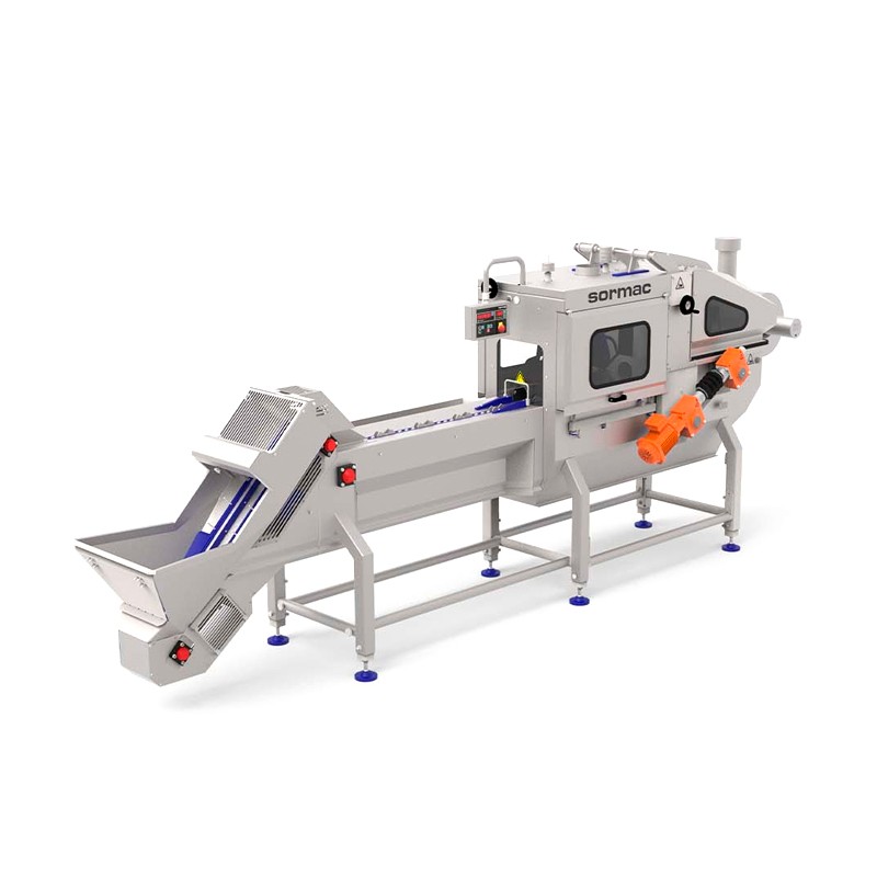 La máquina va equipada con nueve pares de rodillos de transporte que trasladan el producto horizontalmente a través de la peladora. La presión neumática mantiene el producto en posición mientras viaja a través de los 8 portacuchillas, colocados en distintos ángulos para pelar el producto por todos sus lados completando la circunferencia.