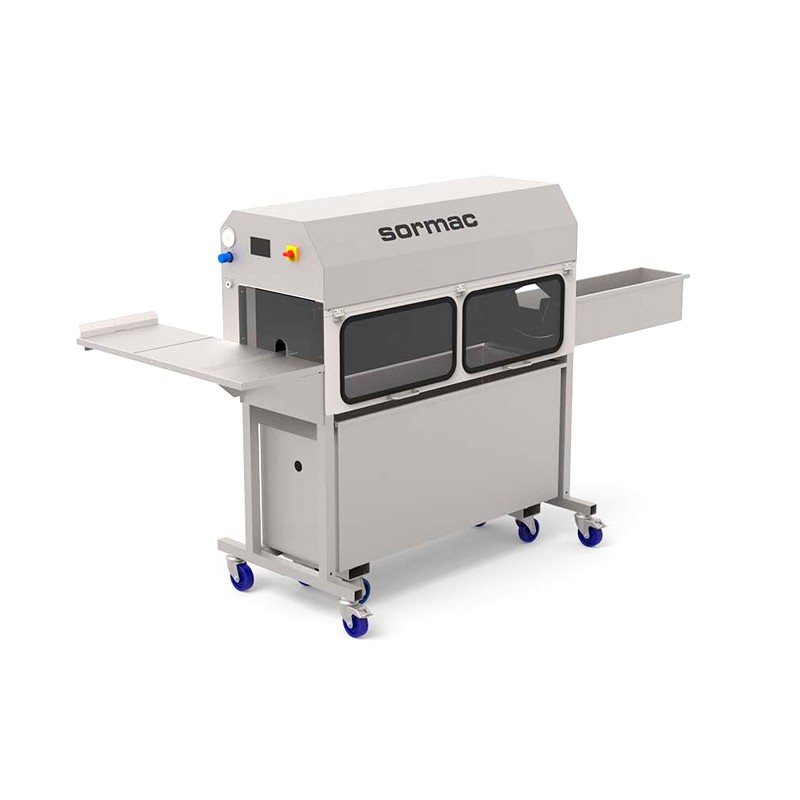 La peladora de cuchillas Sormac tipo KWS es adecuada para pelar zanahorias pequeñas, como las zanahorias baby. El producto se empuja manualmente en la mesa de inserción, entre los primeros dos rodillos de transporte.